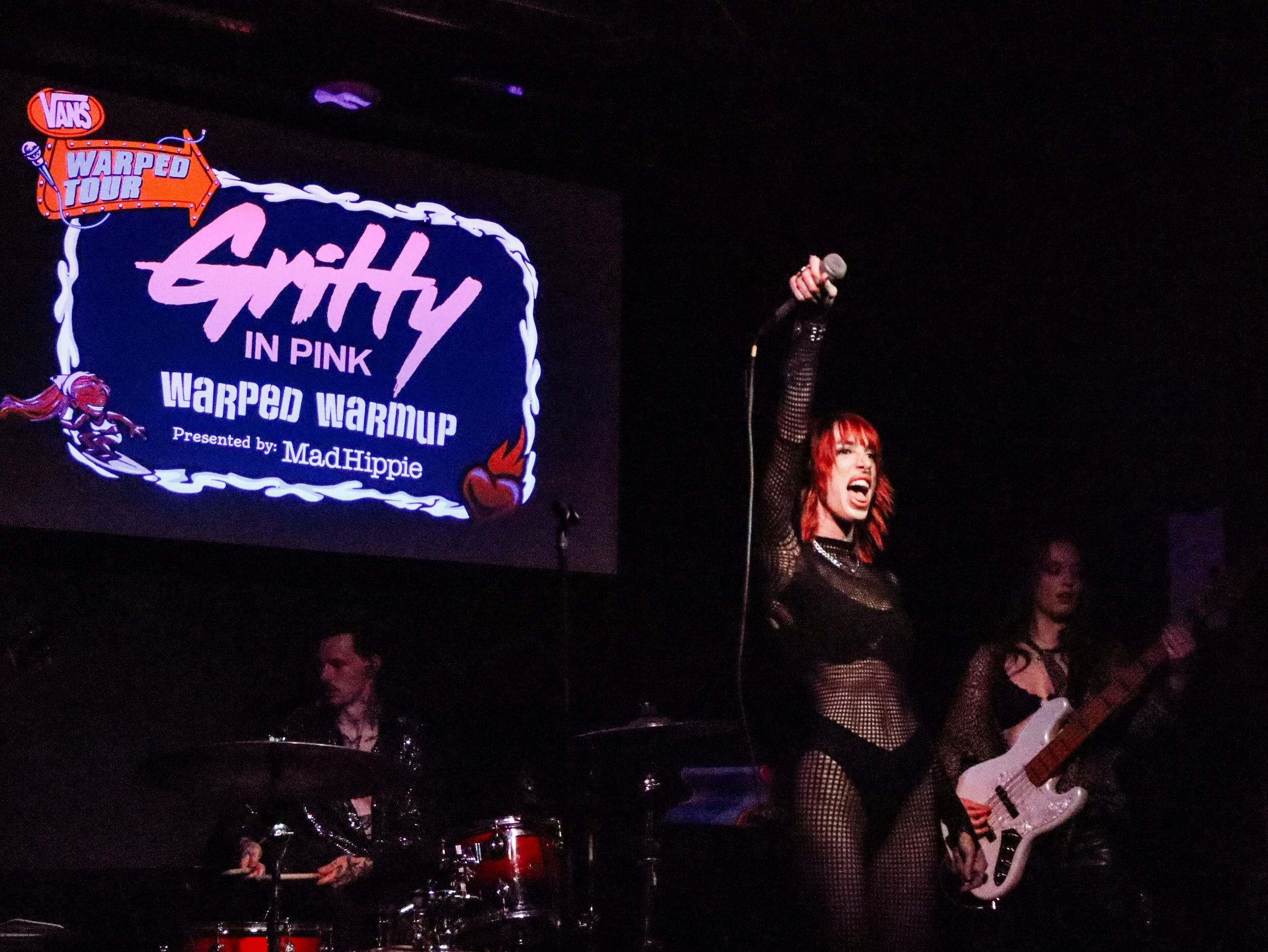 L to R: Sage Weeber (drums), Chandler Leighton (vocals), Aubrey Harris (bass). Not pictured in this photo: Constance Antoinette (guitarist who crushed it the entire show!!)