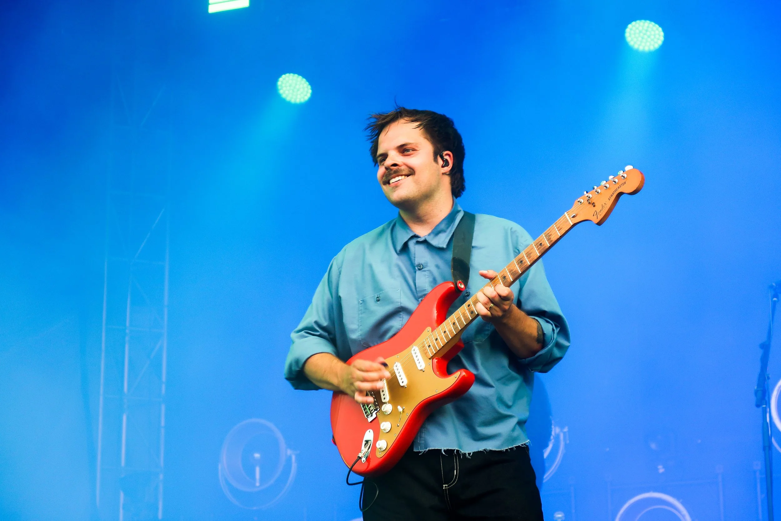 The cries for one more song quickly grew louder. Soon after, Neil returned to the stage with an acoustic guitar. With a single spotlight on him, he asked the crowd if he could play one song solo before the rest of the band joined him. He began to reminisce about how the band got started. He shared that he had always wanted to start a band but never had anyone to start it with. “I was 20 and living with my parents when Chris and his mom moved in down the street,” he said. “I didn’t know Chris, but I’d always kinda saw him around—usually in the places where you’d go to smoke weed at night.” He went on to say that he and Chris attended a music festival separately: “He went with his friends, and I went with mine. I had taken some MDMA—and apparently so had Chris.” They bumped into each other, and Neil said, “We should start a band,” which he later regretted as it felt cliché and embarrassing. To his surprise, Chris took him up on the offer. “This is the first song I wrote and played for Chris,” Neil said as he began to play “Peach Pit.” Halfway through the song, he began to whistle a melody that has since become a guitar riff Chris plays.