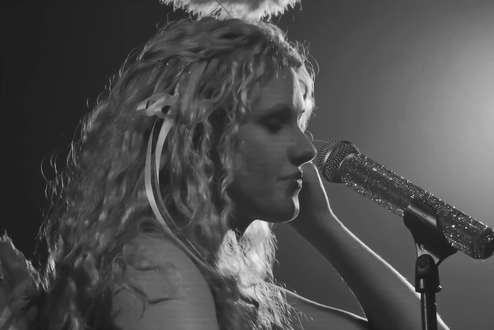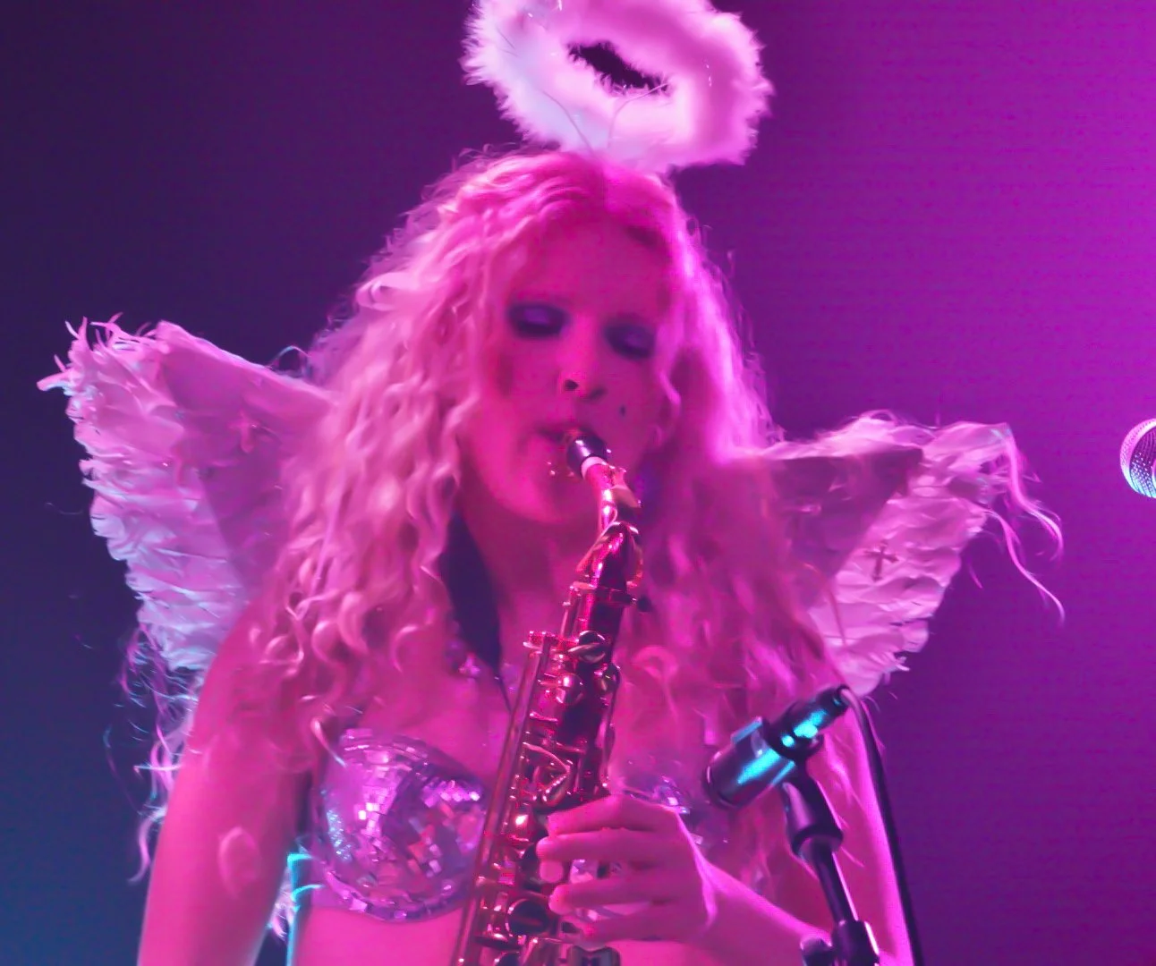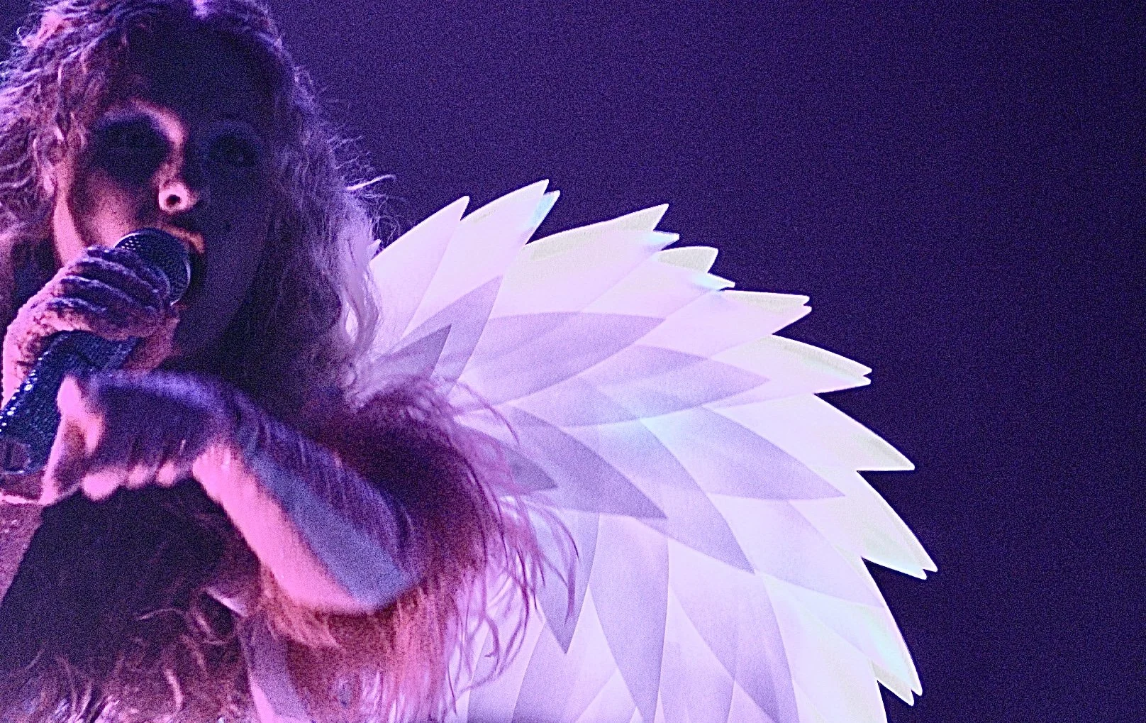 As if appearing out of a dream, Smith emerged onstage donning sparkly hot pink gloves and shorts to match -along with a disco ball-esq. bra, glittery tights and silver platform boots. In true Meg Smith fashion, the singer wore her signature angel wings and halo (“This is what I usually wear onstage” Smith laughed, meaning the angel getup. “Not just because it’s [gonna be] Halloween”). Her long, curly blonde hair dyed hot pink at the roots.