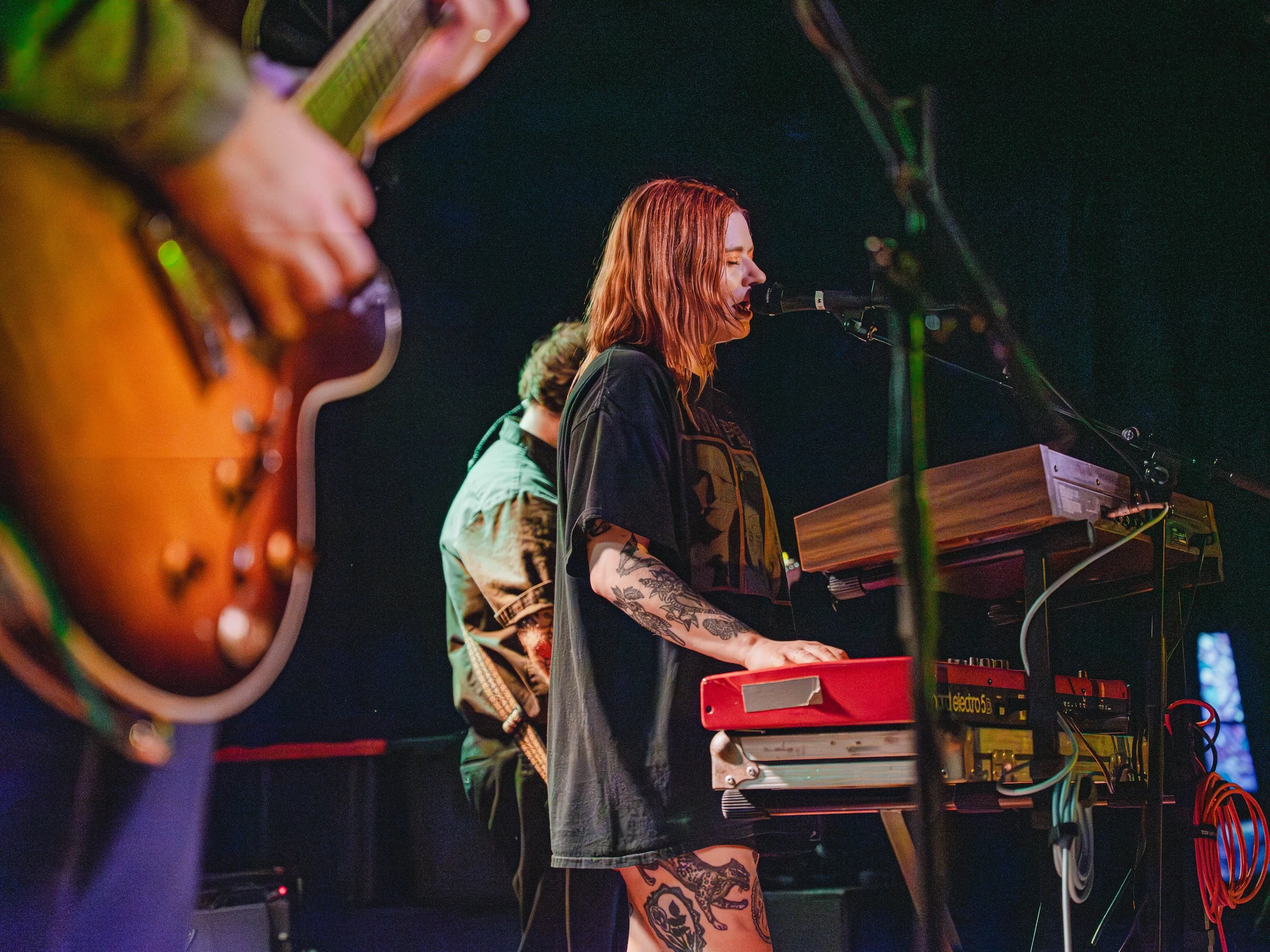 When Tiger’s Jaw took the stage, the lights changed from a vibrant blue and magenta to amber and gold and honey. Tiger’s Jaw consists Ben Walsh, keyboardist/vocalist Brianna Collins, drummer Teddy Roberts, bassist Colin Gorman, and guitarist Mark Lebiecki. They’re celebrating the release of their newest album, “Lost On You,” released March 27th, 2026. The band opened acoustic with “It’s okay” and switched after the first track. Ben Walsh is an electric performer, switching from swaying in one moment to jumping and thrashing in another. His voice is perfect for this sound.
